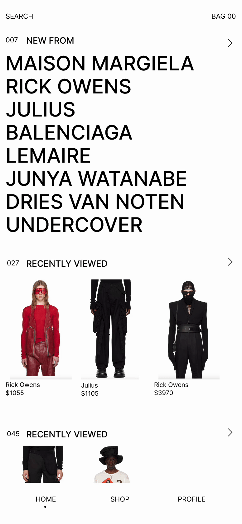 profile page, with wishlist, order history, and menus for notifications, account settings, and also our Size Passport